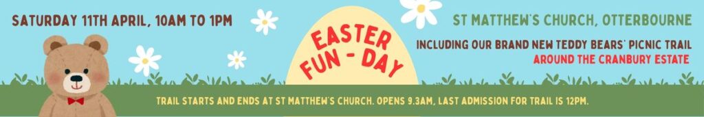 On Maunday Thursday, 2nd April, there will be a service at All Saints’, Compton at 11 am, including the traditional foot washing and a simple shared lunch, followed by an evening service at St. Matthew’s, Otterbourne at 7.30 pm. We begin Good Friday with a gathering at the Wayside Cross on Shawford Down, followed by a Walk of Witness to All Saints’, Compton, where we will hold a Good Friday service followed by coffee and hot cross buns. At 12 noon, there is a service at St. Matthew’s Otterbourne, followed by a sung vigil from 1 pm to 3 pm. A reading of the Passion will take place at All Saints’, Hursley at 3pm. On Easter Sunday we celebrate with joy the resurrection of Jesus Christ, our Lord. A Daybreak Service will be held at the Wayside Cross on Shawford Down, followed (as tradition happily dictates!) by bacon sandwiches. Later in the morning, Easter Day services with Family Communion will be held across our three churches at the usual times. There will also be a Sung Evensong for Easter Day at St. Matthew’s, Otterbourne at 6 pm. Whether you come along for a quiet moment of reflection, a traditional service